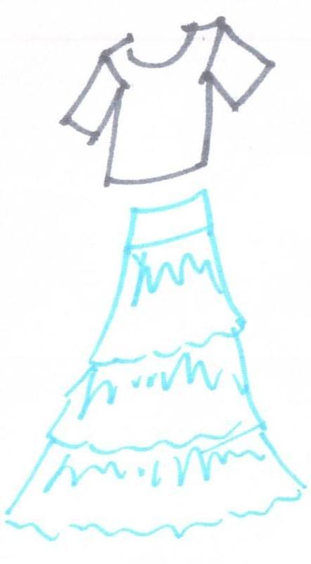 a b-e-a-uuuutiful combination - i only did the colours for lack of a biro but i think the grey and blue woorrrrk like a factory machine. crop tops are EASY and fun too, all you have to do is get a men's top (grey in this case) and chop it in half. voilaaaaa crop top! the skirt's a bit more tricky, but not too bad. get the fabric (linen maybe) and pleat it as you sew, and then layer the next layers onto a base. in the sketch the skirt's quite long. it looks good, but i don't think i'd wear it. for one, i couldn't afford that much fabric and secondly i really like my legs ;).